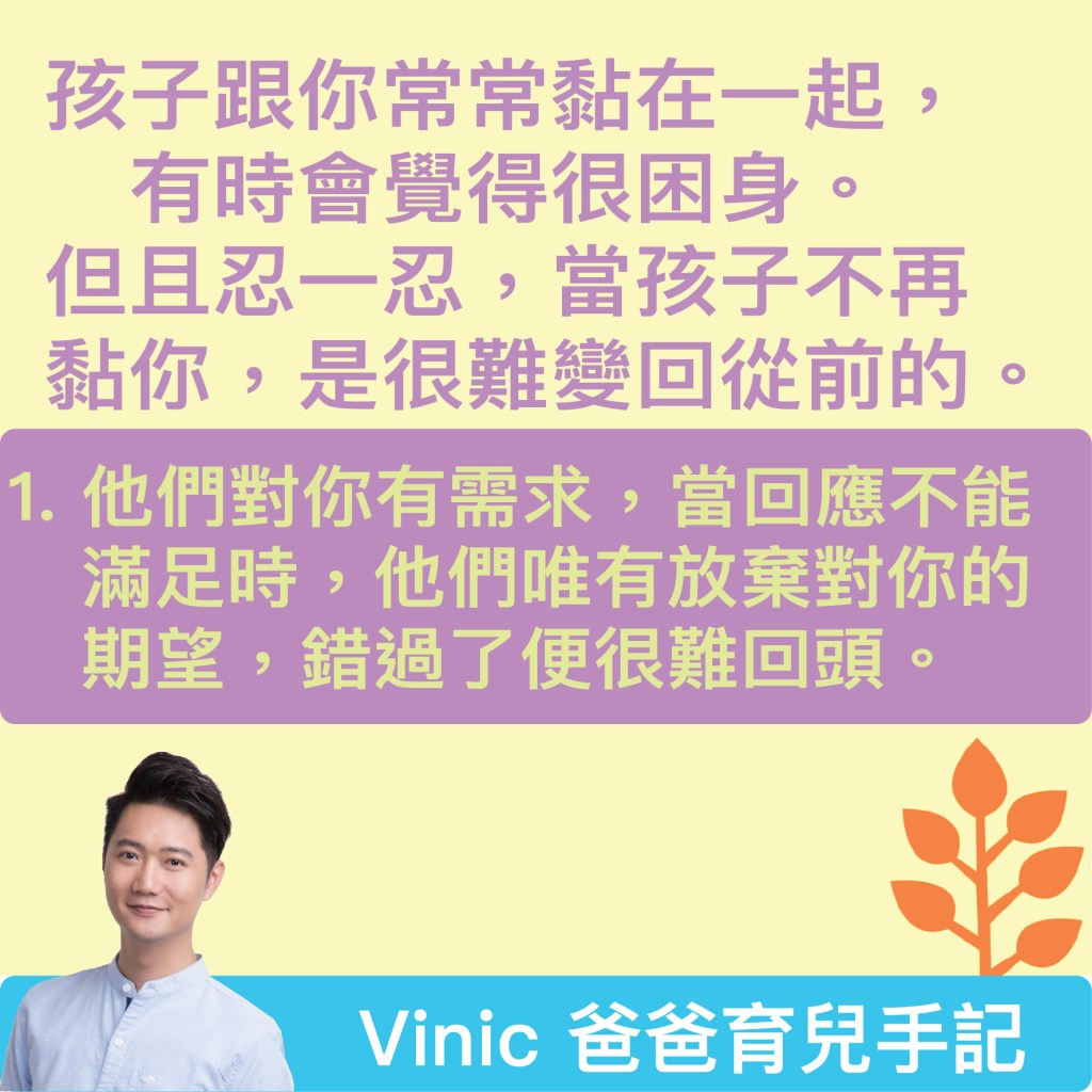 孩子跟你常常黏在一起, 有時會覺得很困身。